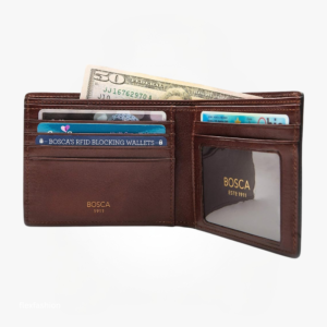 Men’s Leather Wallet: Featuring a classic design with a modern style, this executive wallet is made with simplicity and storage in mind; features 5 card slots, 2 full-length bill pockets, 2 hidden pockets, and a clear ID window with RFID security lining.