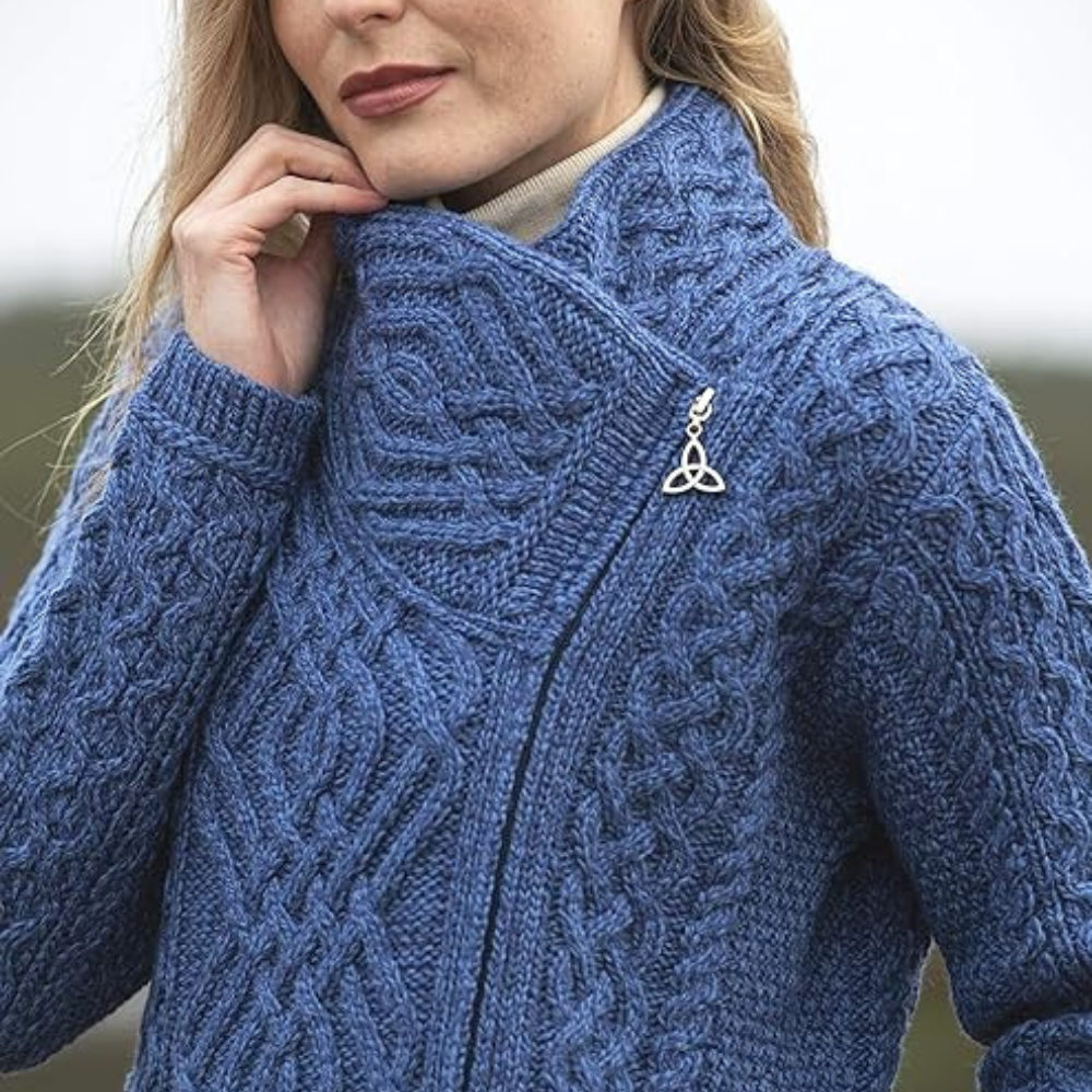 Women’s Irish cable knit cardigan made from 100% merino wool with side zip design—soft, warm, and perfect for stylish everyday comfort.