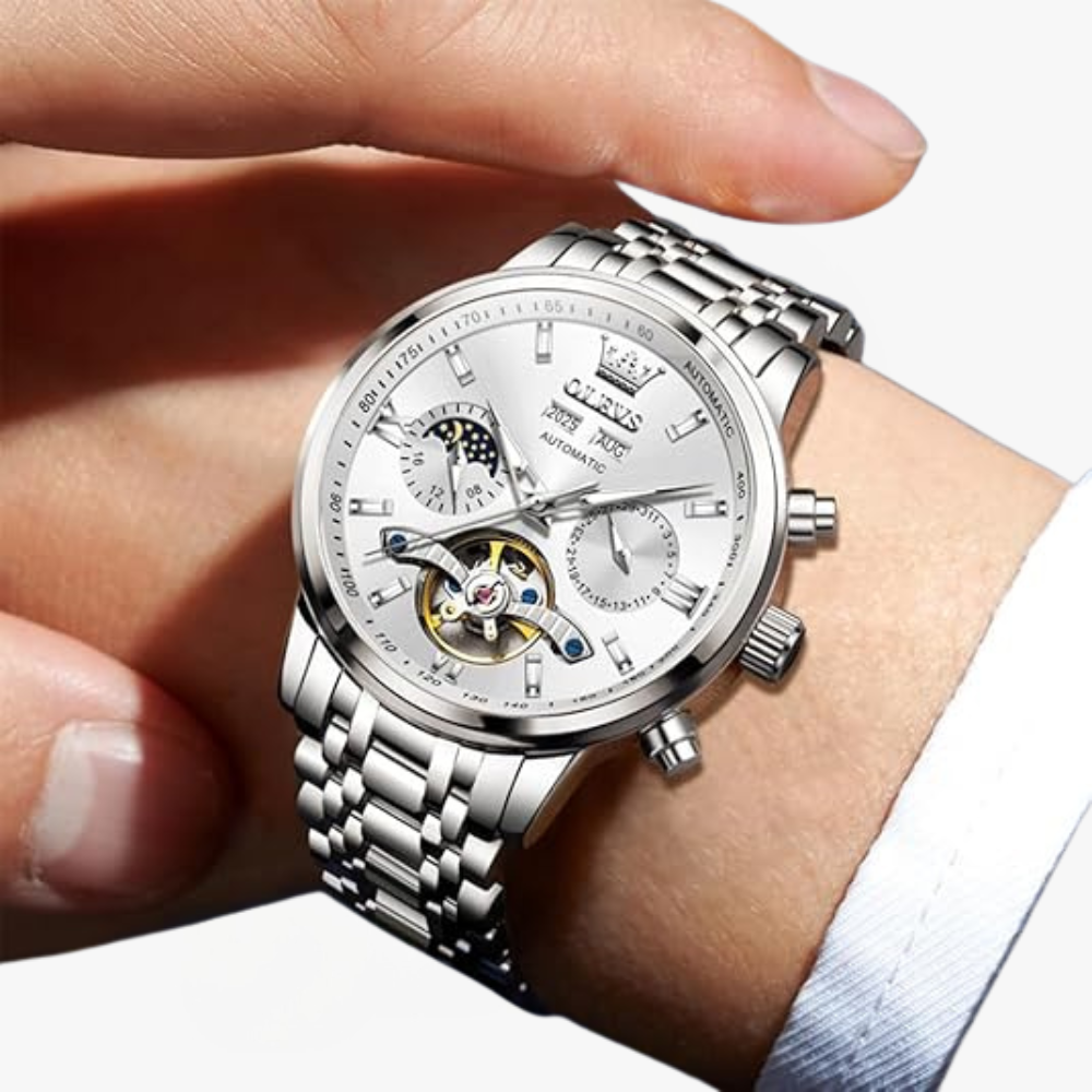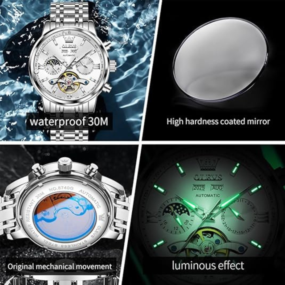 | Additional Features | Business Dress male silver Watch, Classic Luxury Tourbillon Skeleton Man Watch, Luxury Diamond Mechanical Men Watch, OLEVS men Automatic Watches Stainless Steel, Waterproof Self Winding man Watches |