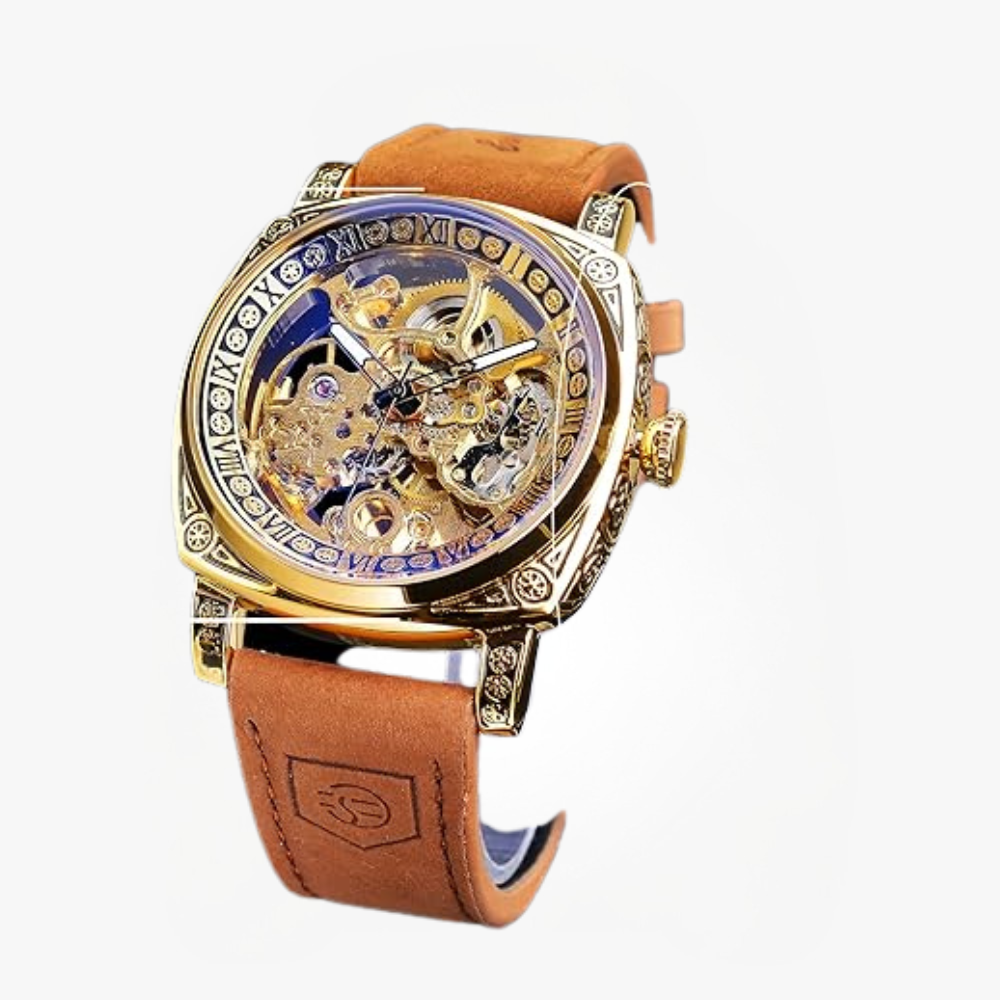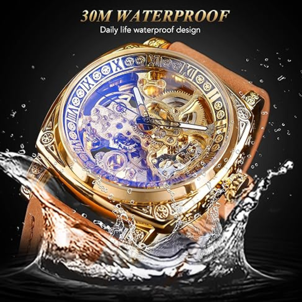 Discover the men’s skeleton watch with 7 powerful features including automatic self-wind movement, vintage square design, carved dial, and premium leather strap.